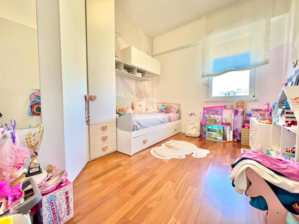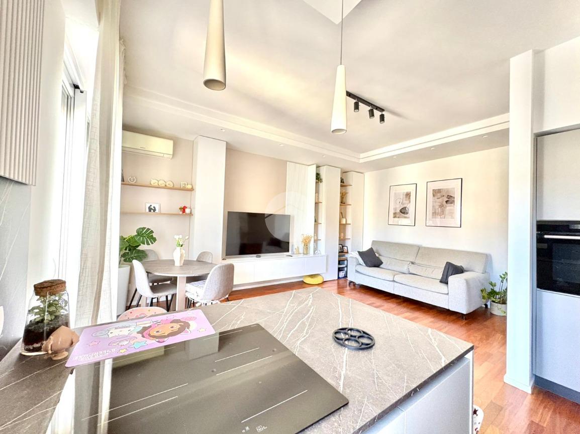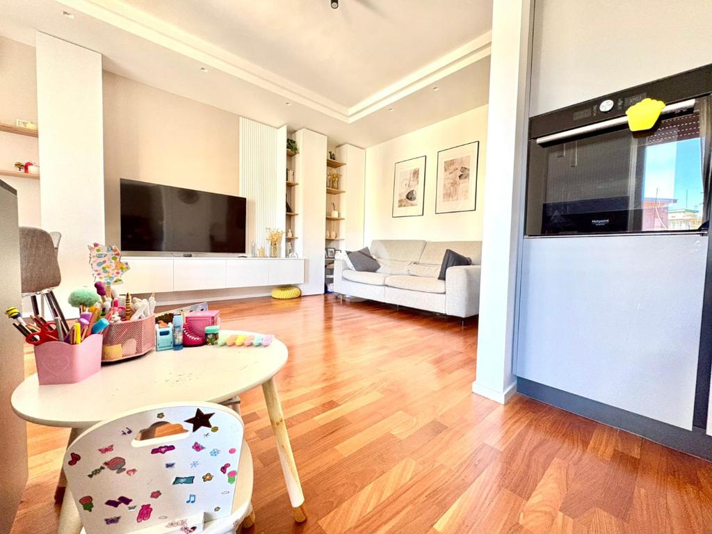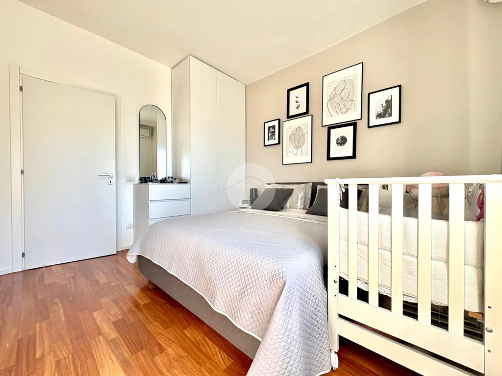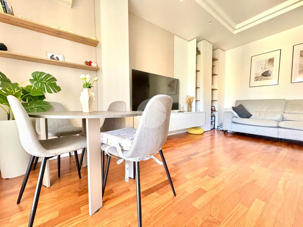 L’ingresso si apre su un ampio disimpegno che conduce alla zona notte, composta da una camera da letto matrimoniale con cabina armadio e bagno privato, e da una cameretta. Un secondo bagno completa la zona notte. La zona giorno è caratterizzata da una moderna cucina a vista che si fonde armoniosamente con il salone living, con accesso diretto a un comodo balcone.