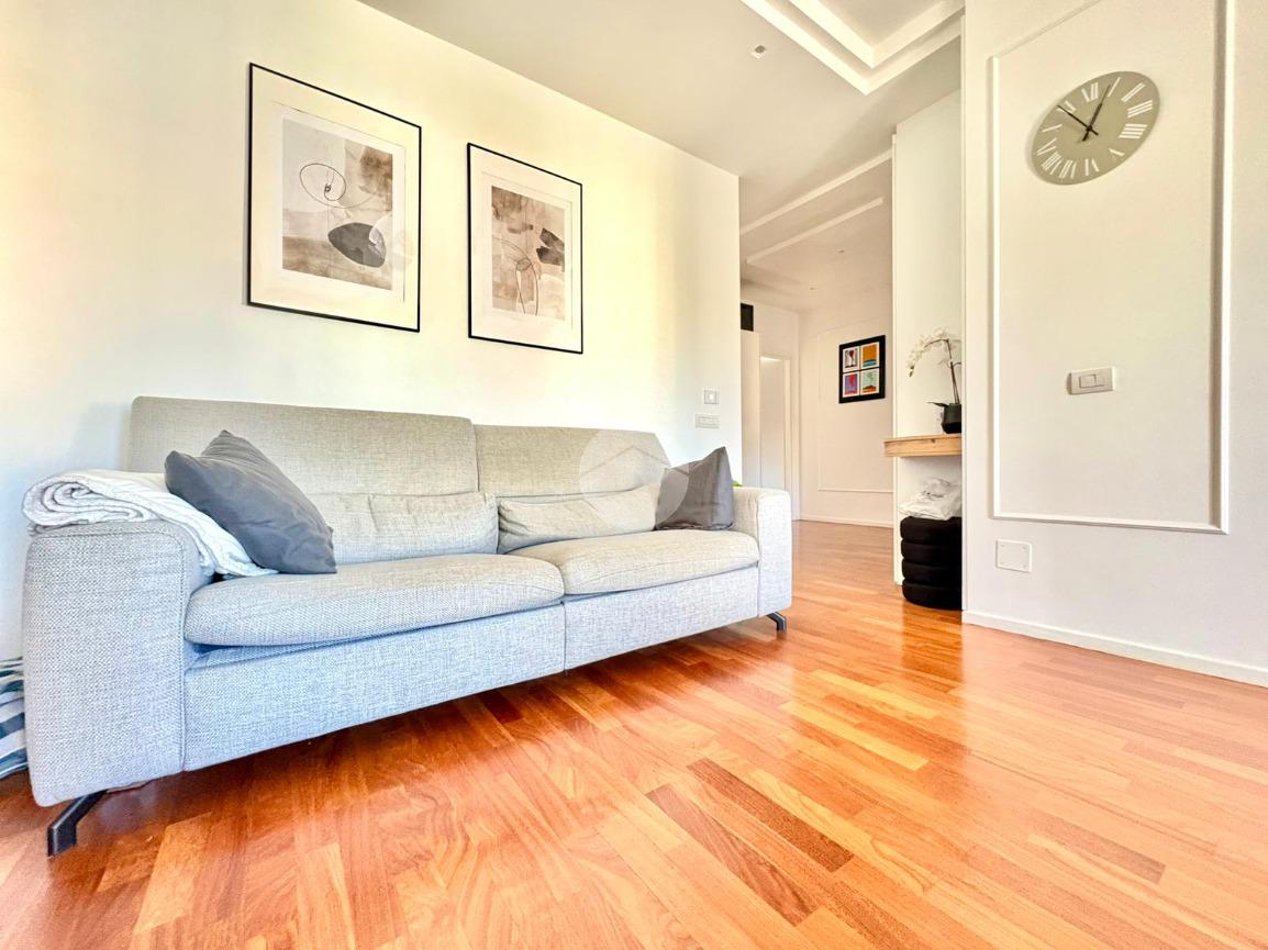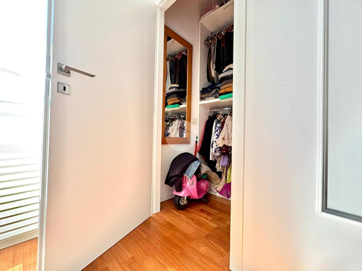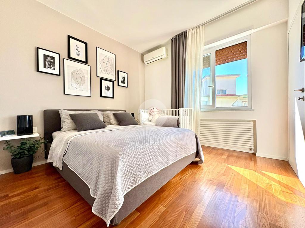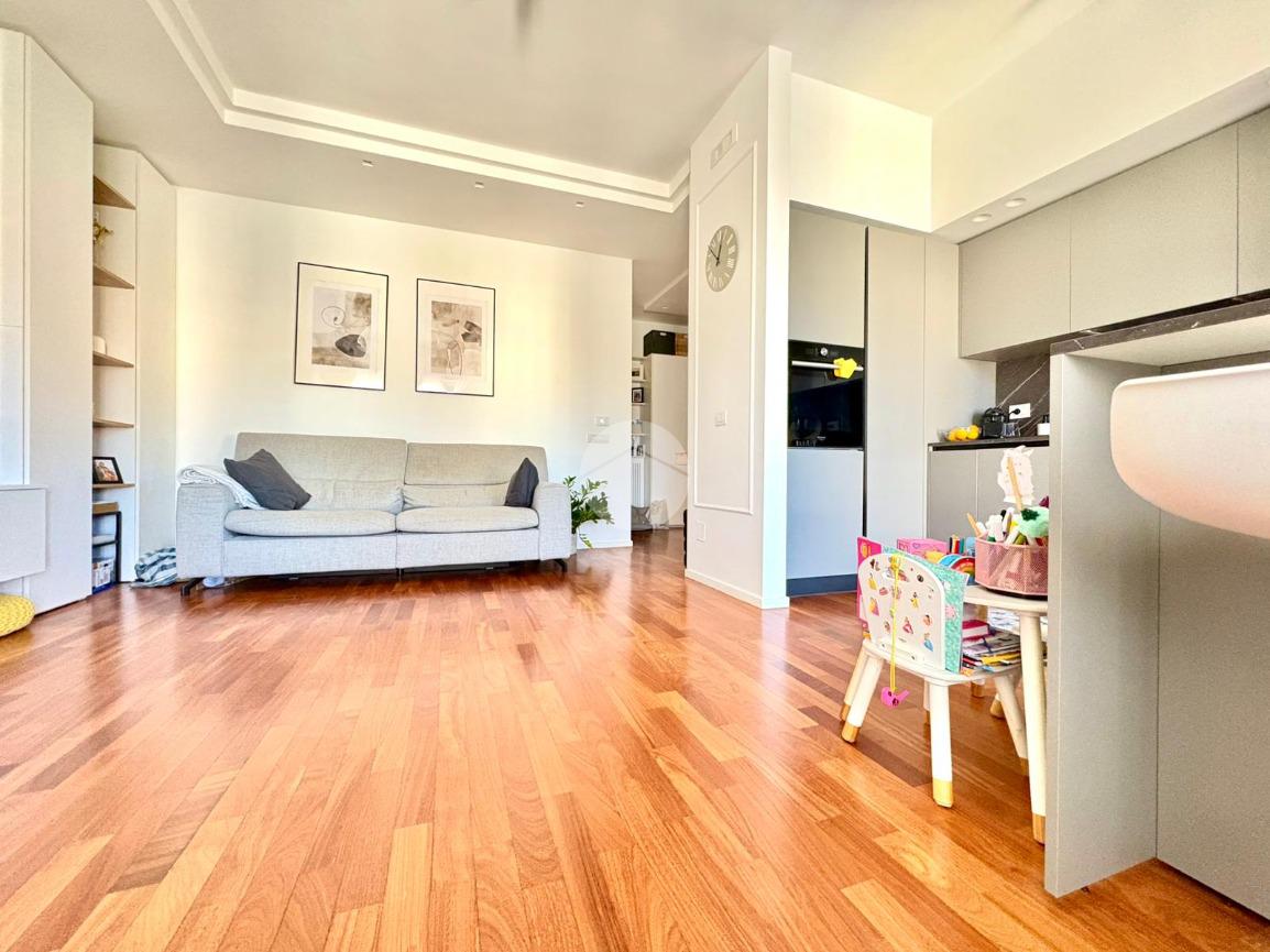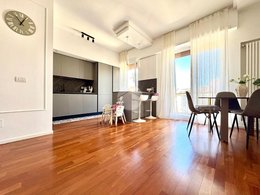 L’ingresso si apre su un ampio disimpegno che conduce alla zona notte, composta da una camera da letto matrimoniale con cabina armadio e bagno privato, e da una cameretta. Un secondo bagno completa la zona notte. La zona giorno è caratterizzata da una moderna cucina a vista che si fonde armoniosamente con il salone living, con accesso diretto a un comodo balcone.