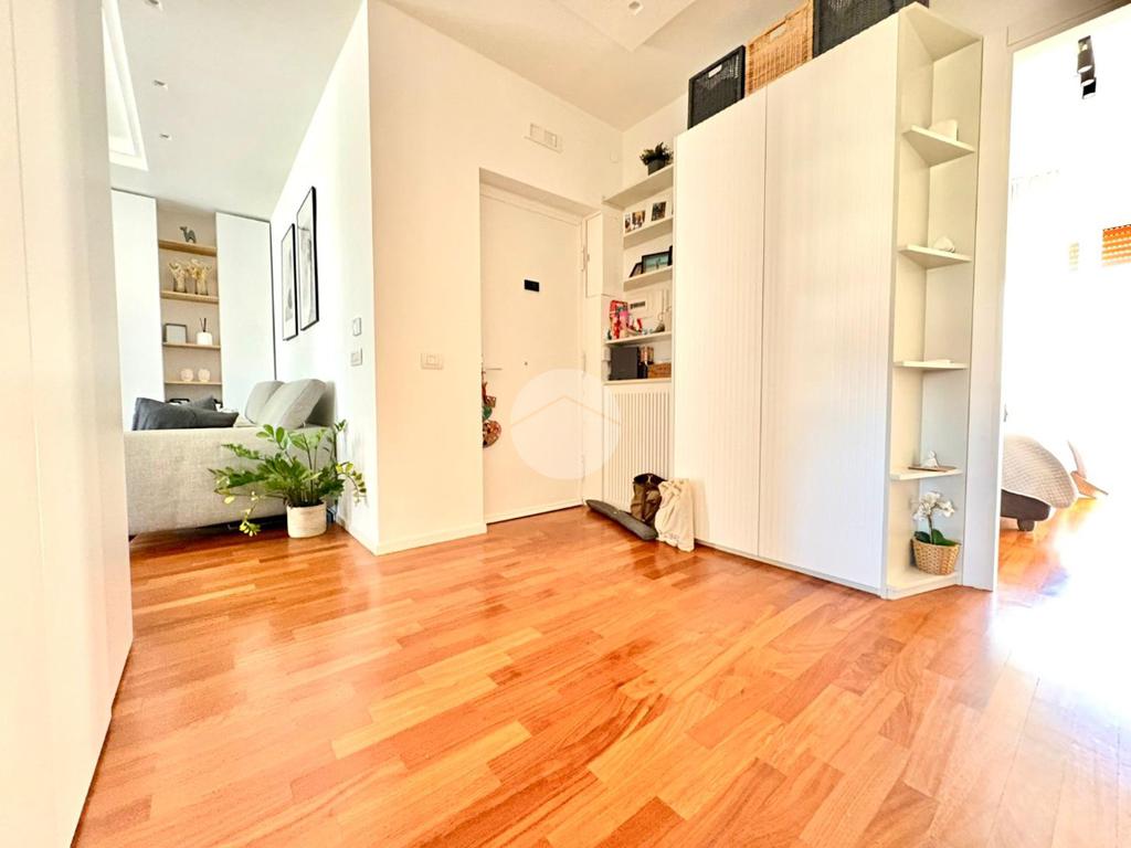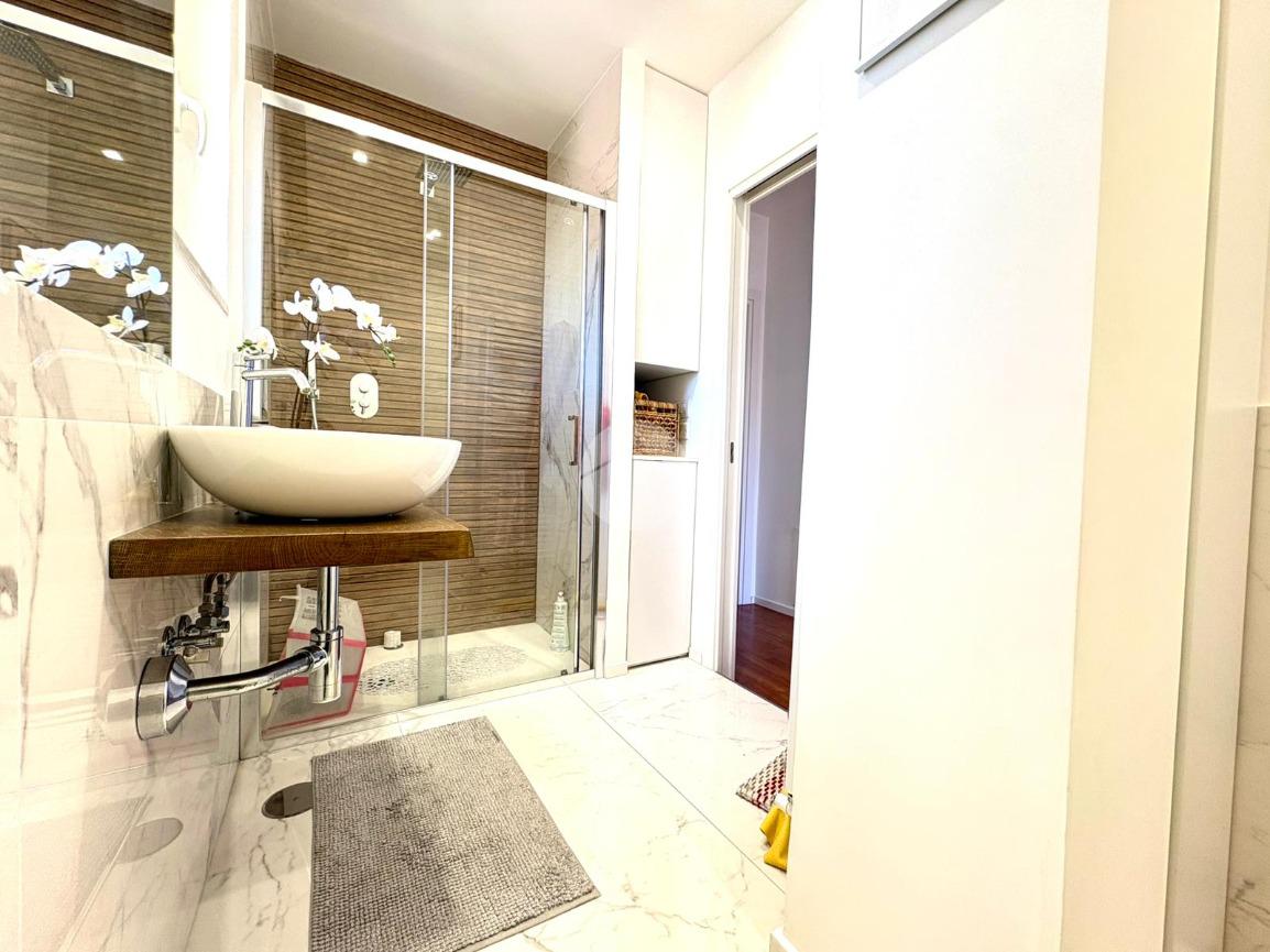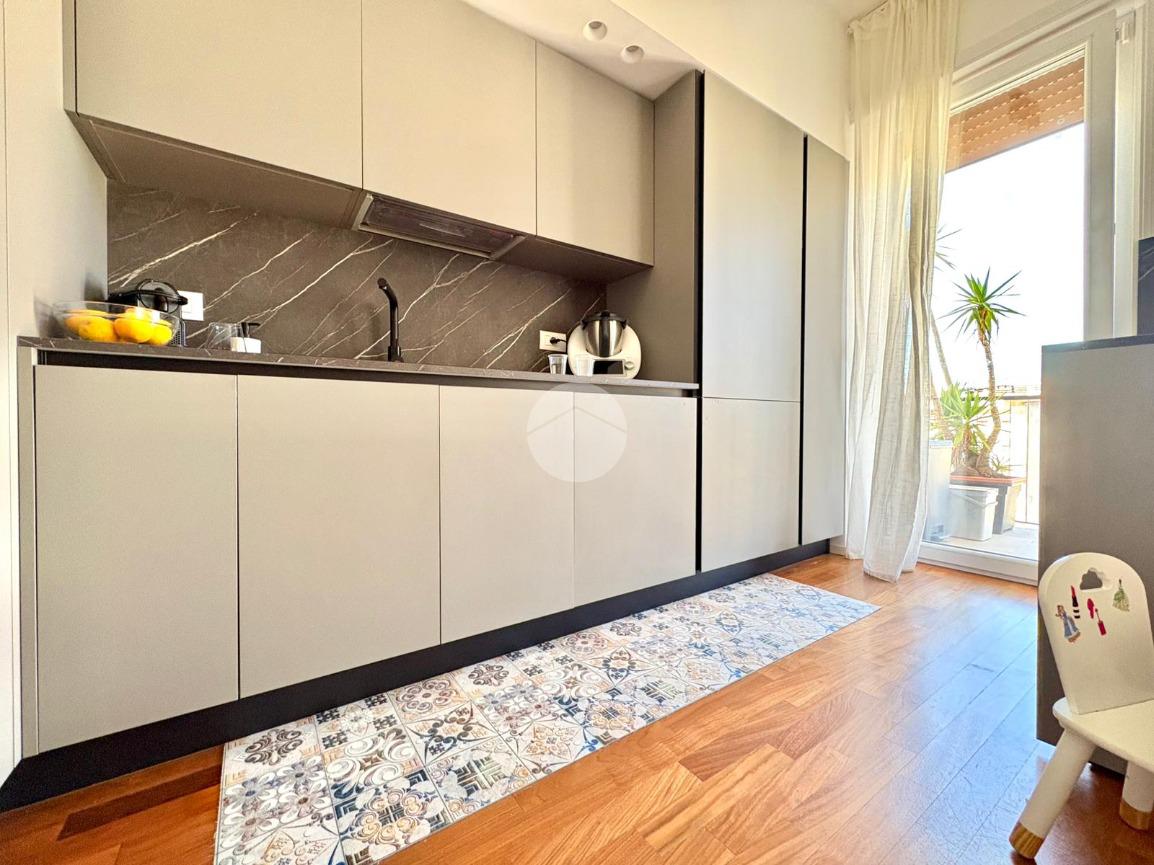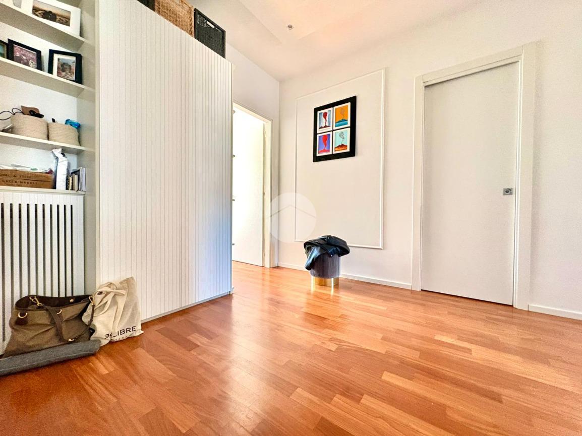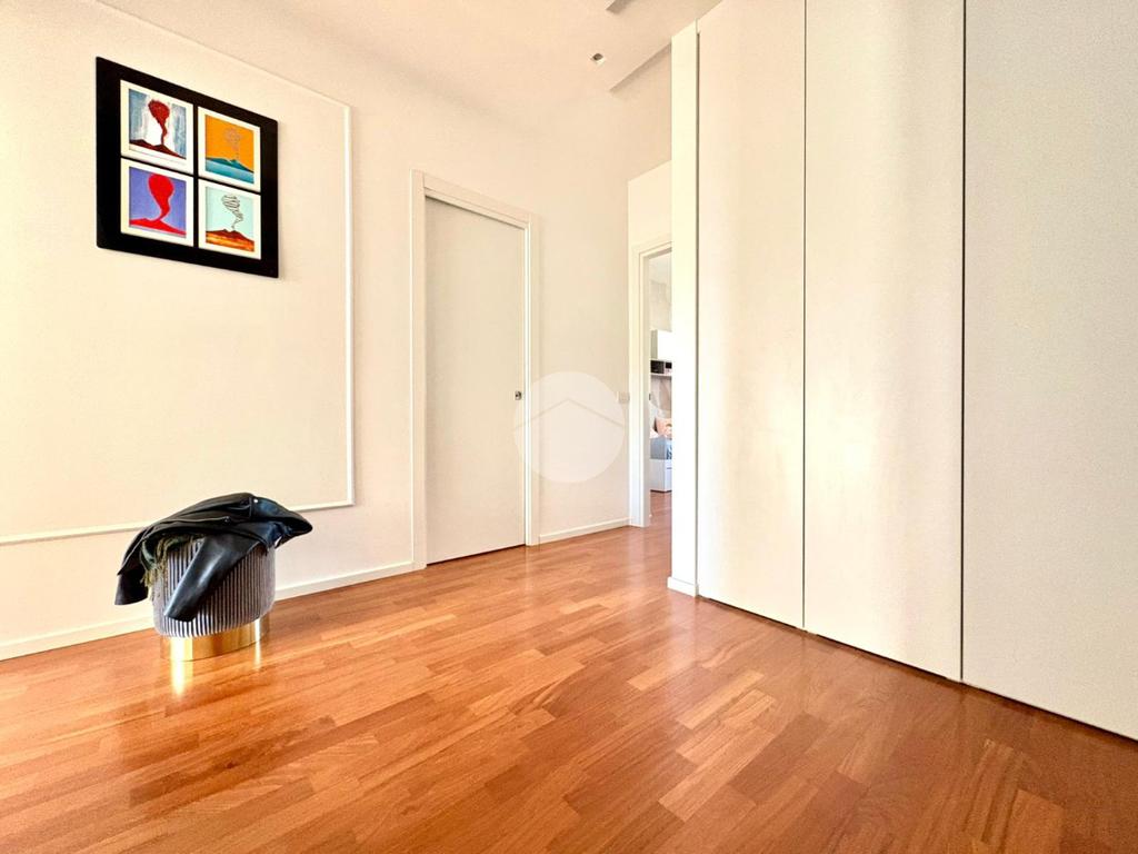 L’ingresso si apre su un ampio disimpegno che conduce alla zona notte, composta da una camera da letto matrimoniale con cabina armadio e bagno privato, e da una cameretta. Un secondo bagno completa la zona notte. La zona giorno è caratterizzata da una moderna cucina a vista che si fonde armoniosamente con il salone living, con accesso diretto a un comodo balcone.