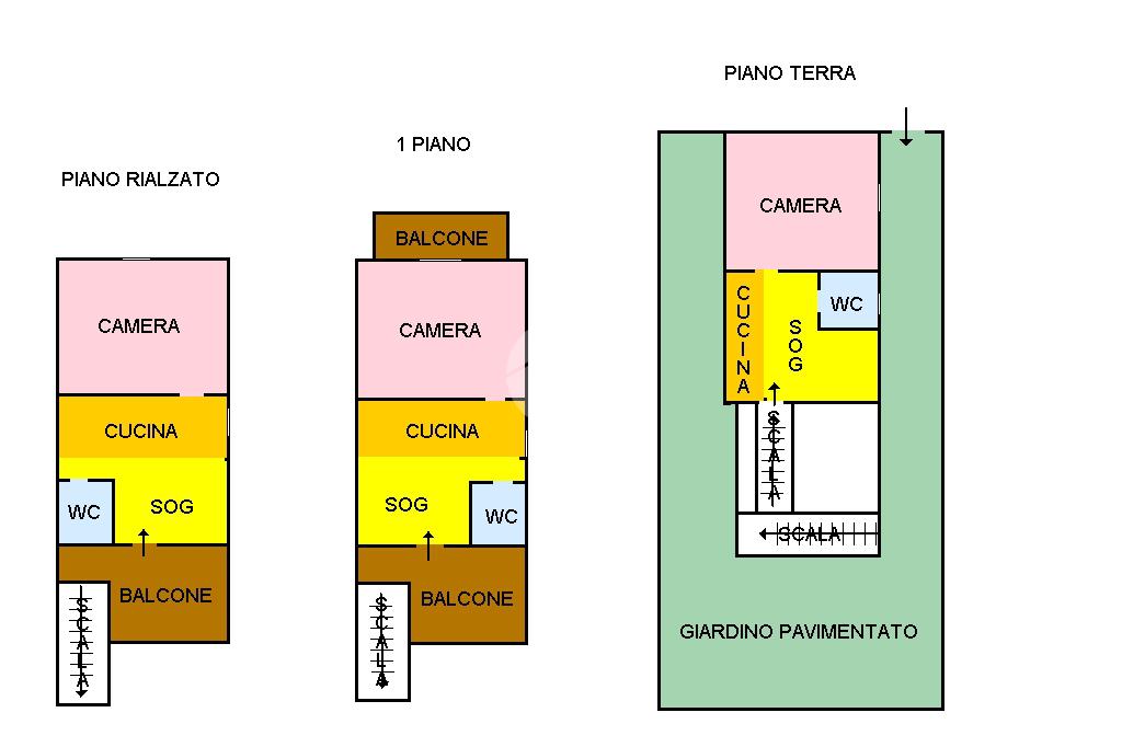 Piano Terra: ingresso in living con cucina a vista, camera letto e wc con finestre. Piano Rialzato: ingresso dal terrazzino, living con cucina, camera da letto e wc con finestre. Primo Piano: ingresso dal terrazzino, living con cucina, camera da letto con balcone e wc con finestra.